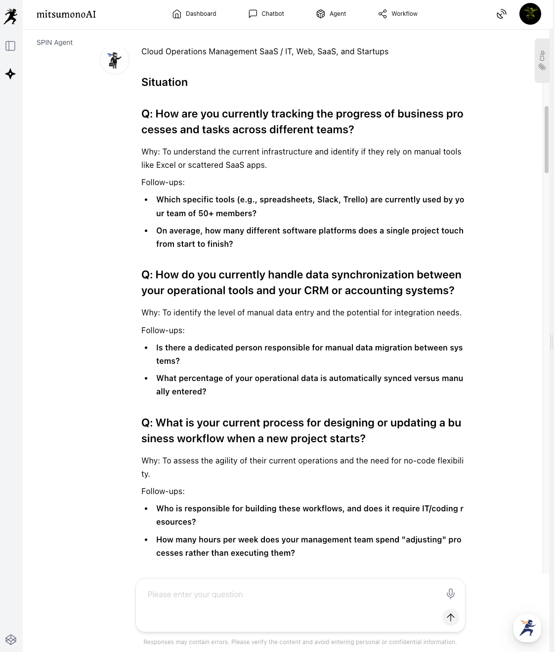 Spin Agent is more than just a tool for listing questions.Based on the world-renowned "SPIN Selling" framework, it automatically constructs a set of questions that approach the customer's subconscious mind in stages.