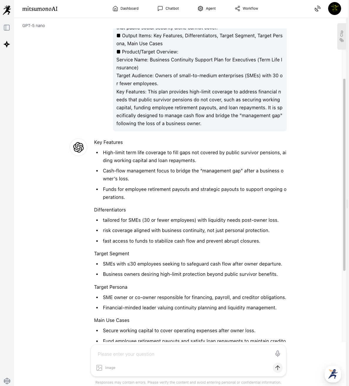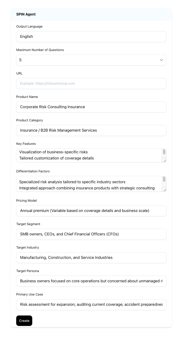 "Based on the following information, please create the input settings for 'Spin Agent,' a question-generation tool for insurance sales. Provide concise bullet points of 100–200 characters for each.