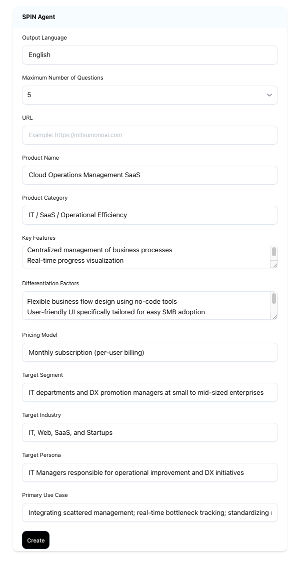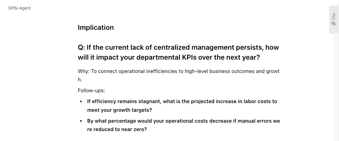 Based on your SaaS features and differentiators, this tool automatically outputs a "designed set of questions" to deep-dive into customer issues. It saves sales reps the trouble of brainstorming questions from scratch, as the AI constructs a logical SPIN structure (Situation, Problem, Implication, Need-payoff).