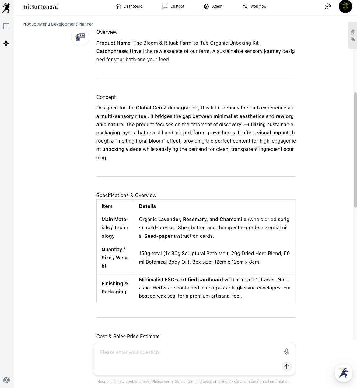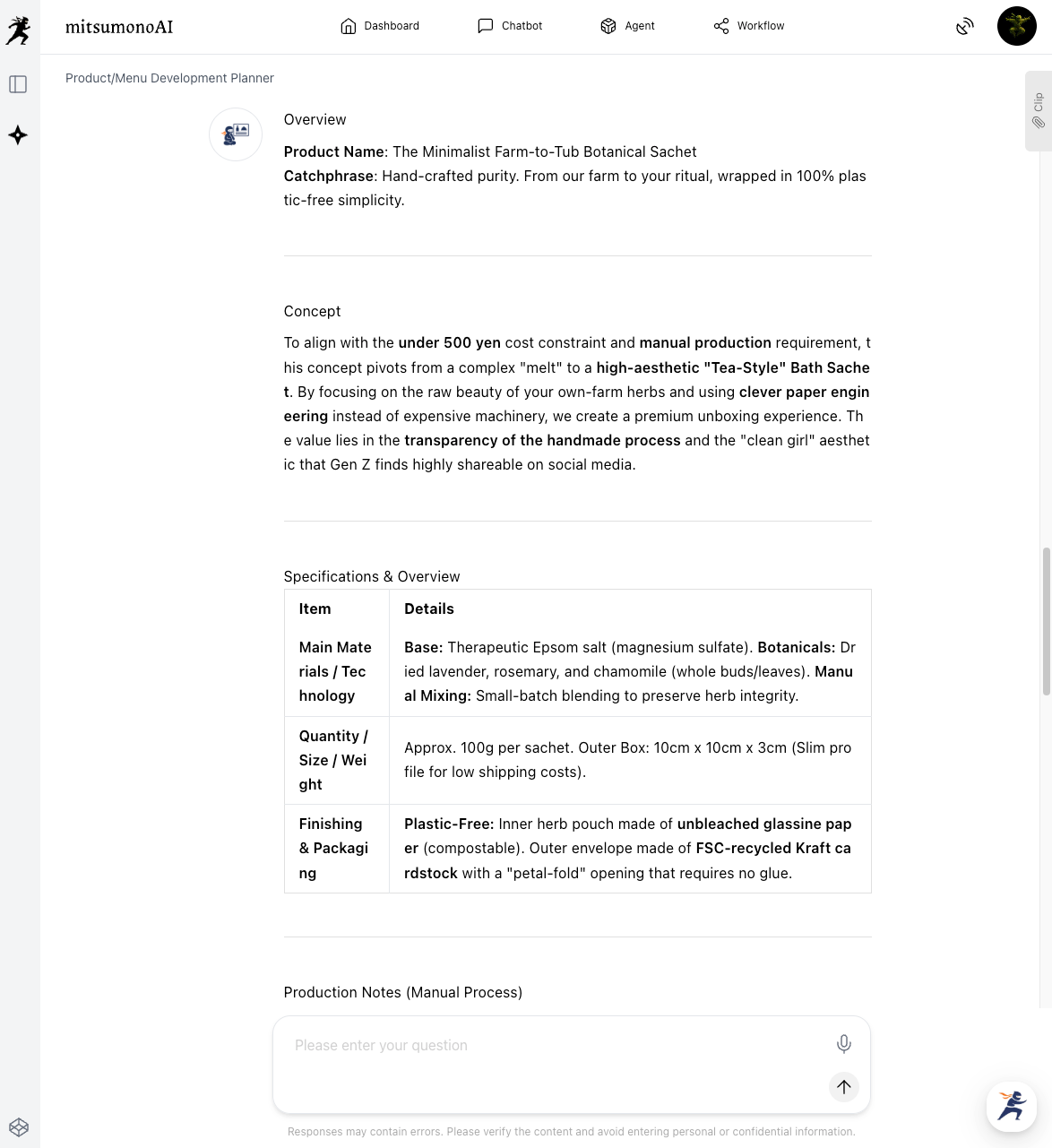 The product plan proposed by the AI in Step 1 is just an ideal concept. From here, use the chat feature to tell the AI about your company’s actual constraints and specific preferences to refine it into a feasible plan.