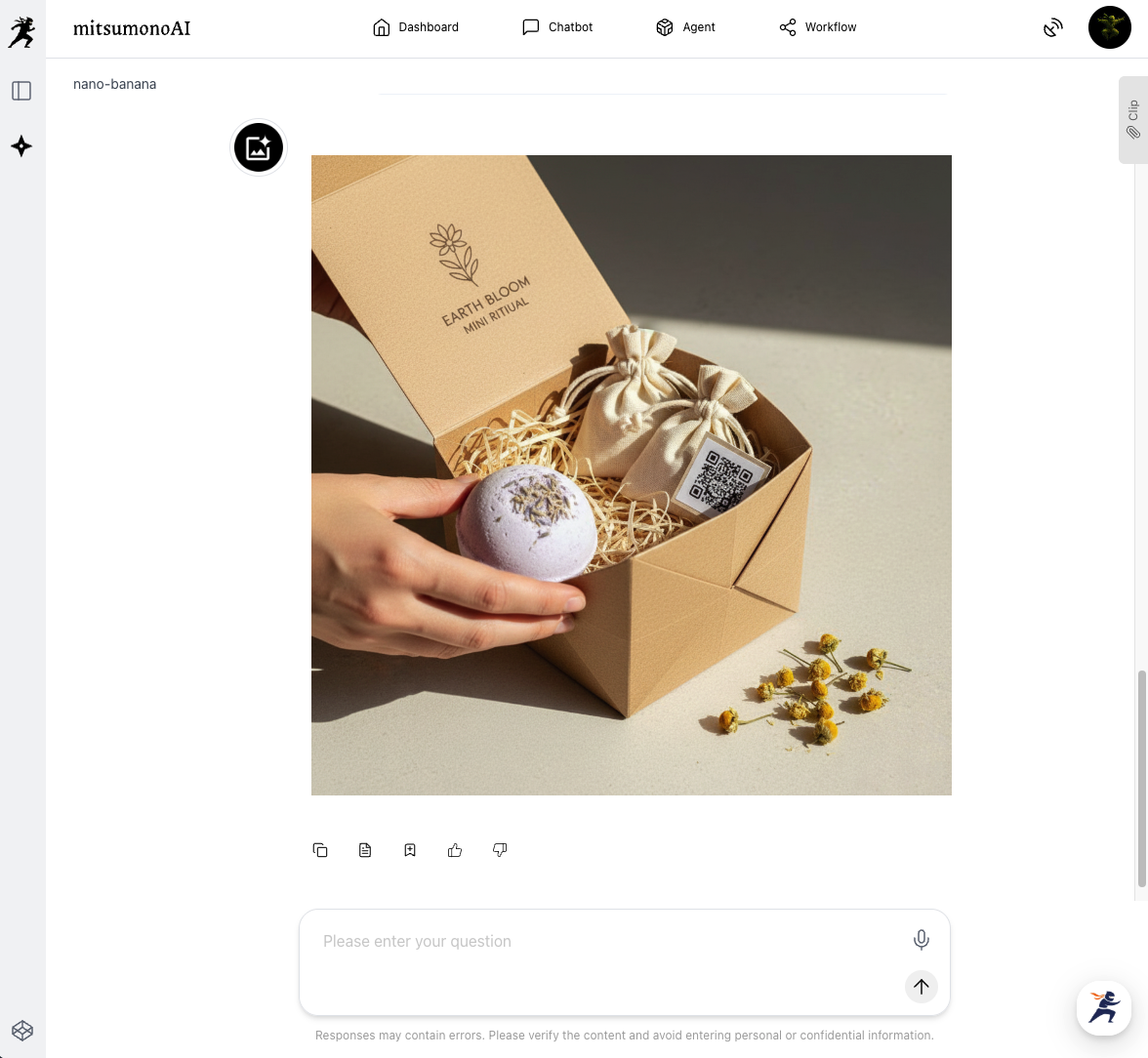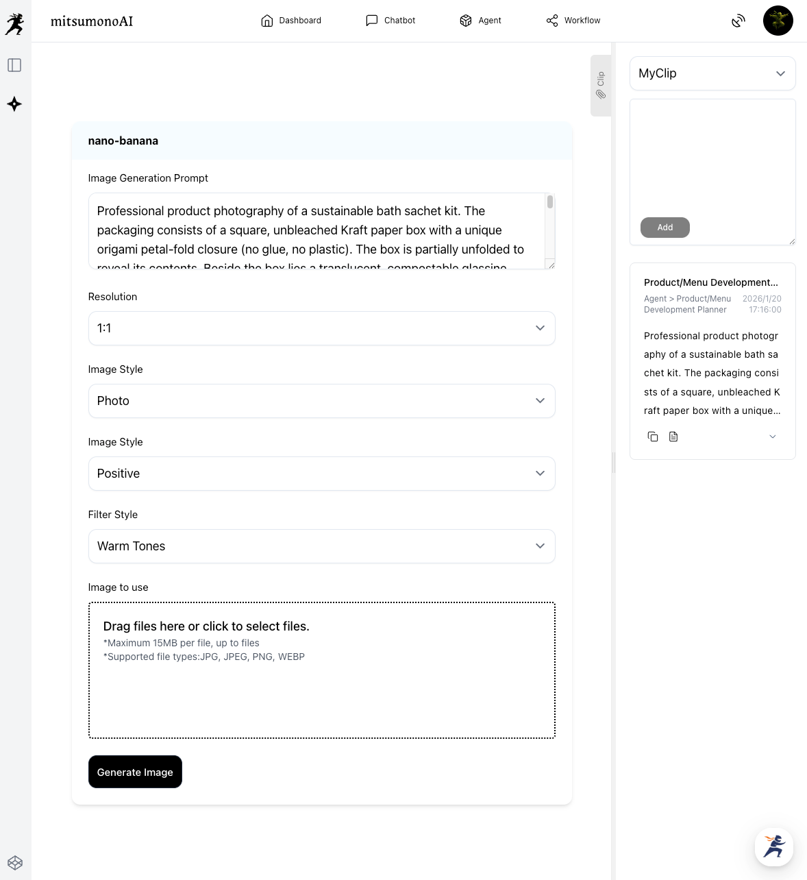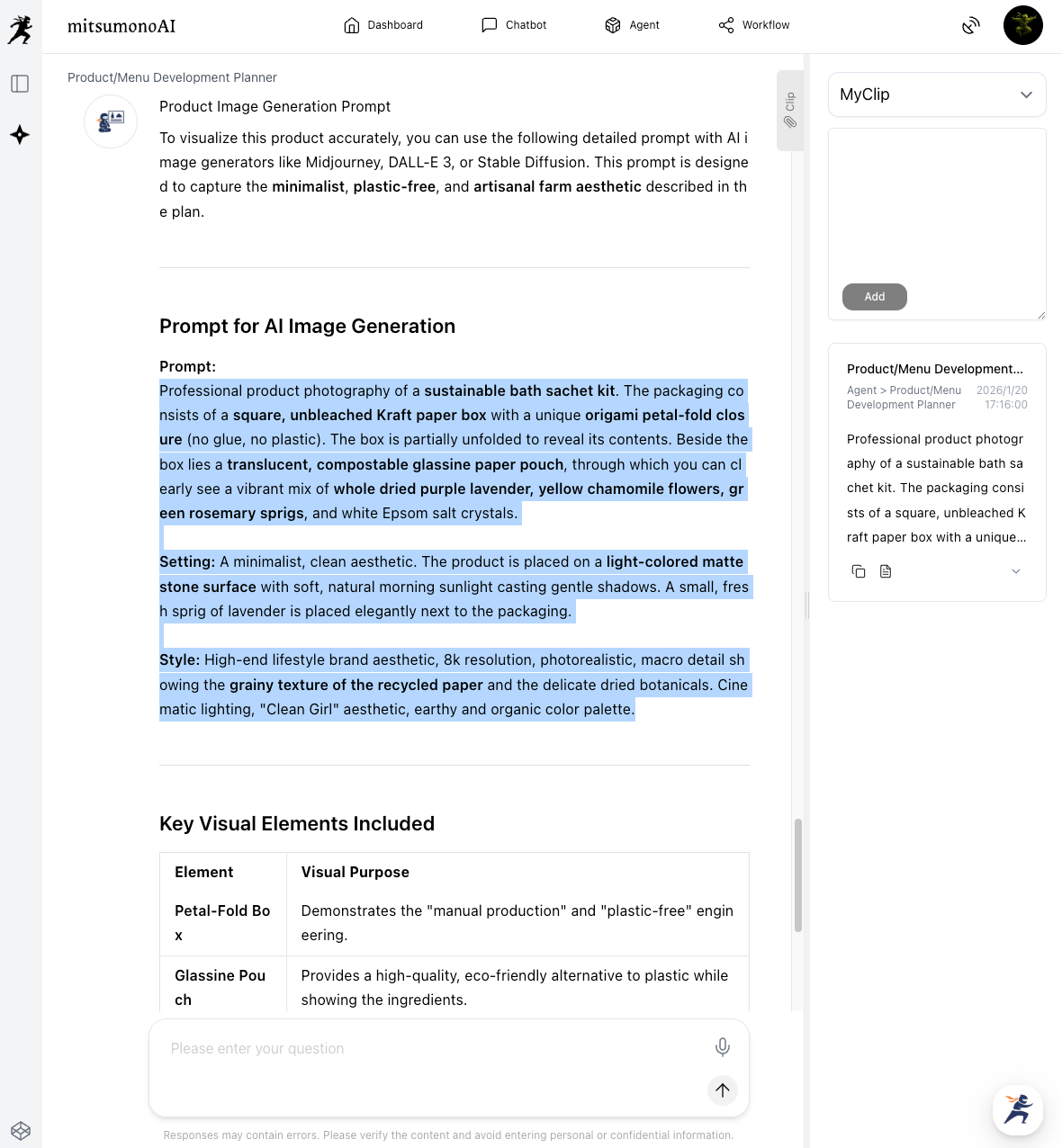 Save this generated prompt to your Clip. By pasting it into mitsumonoAI’s image generation tool (e.g., nano-banana), you can visually confirm the final look of a product that doesn't even exist yet.