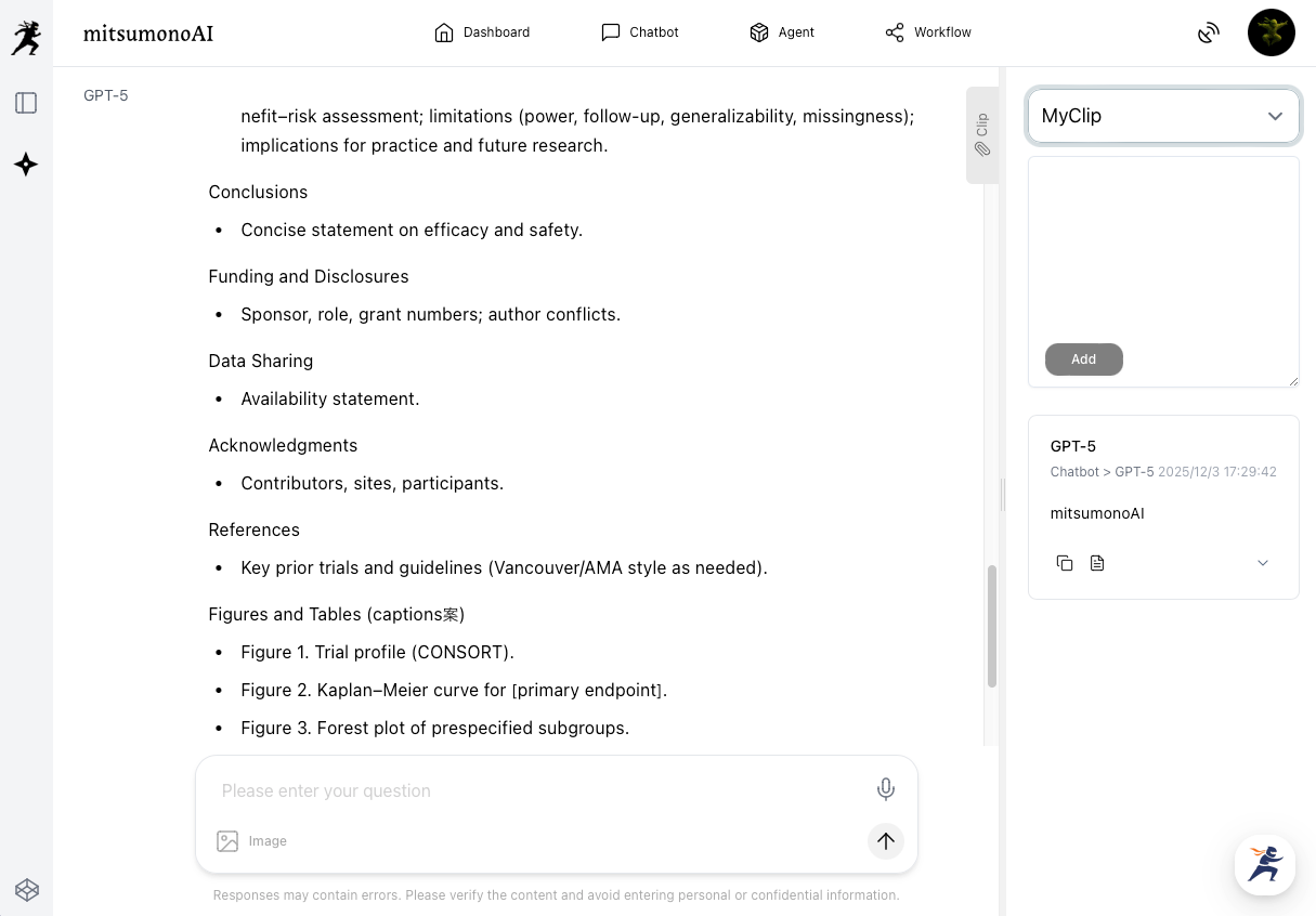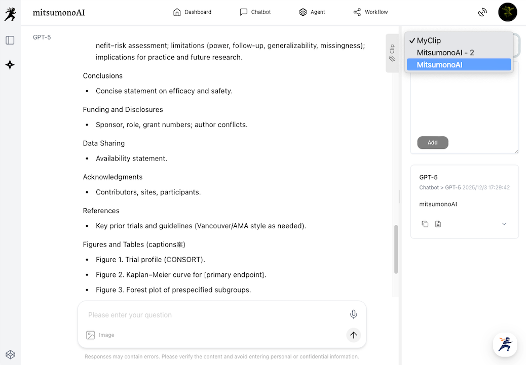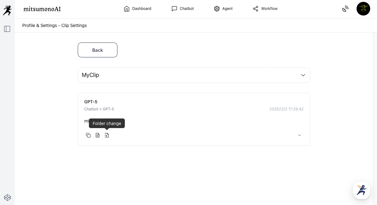 The newly added "Clip Feature" allows users to temporarily or permanently save text information outputted by various mitsumonoAI assistants or information inputted by the user, making it easy to reference and reuse later.