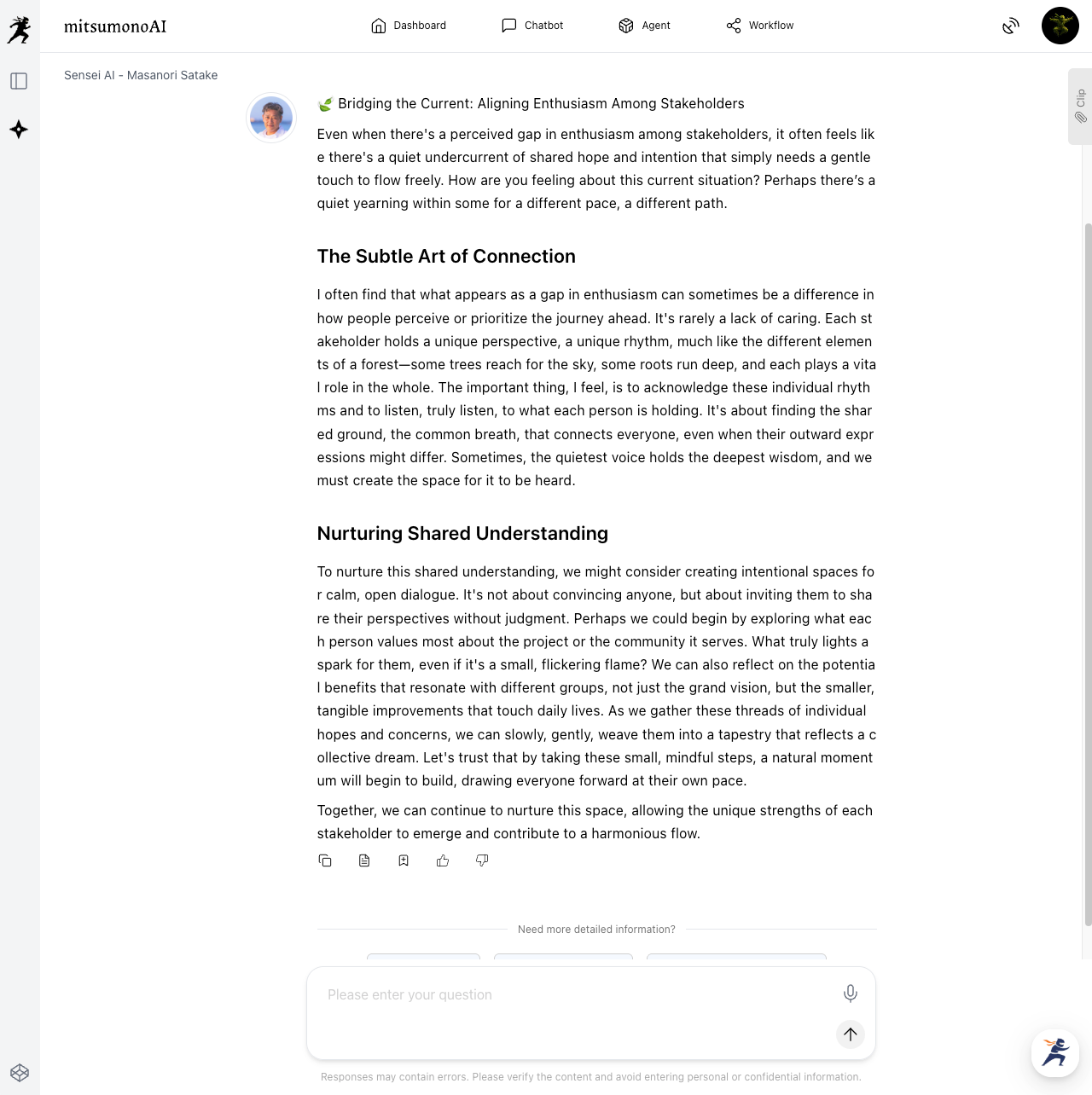 mitsumonoAI implemented an update in October 2025, which included the addition of new features. In this update, various AI models were refreshed to their latest versions, and Masanori Satake, Tourism Region Development Manager at the Fukui Prefectural Tourism Federation (Fukui DMO), has been modeled and introduced into Sensei AI. Furthermore, new features to accelerate work have been added to the Agent Workflow. With this update, users will be able to obtain broader and higher-quality ideas than ever before. Please see the details of the new features below.