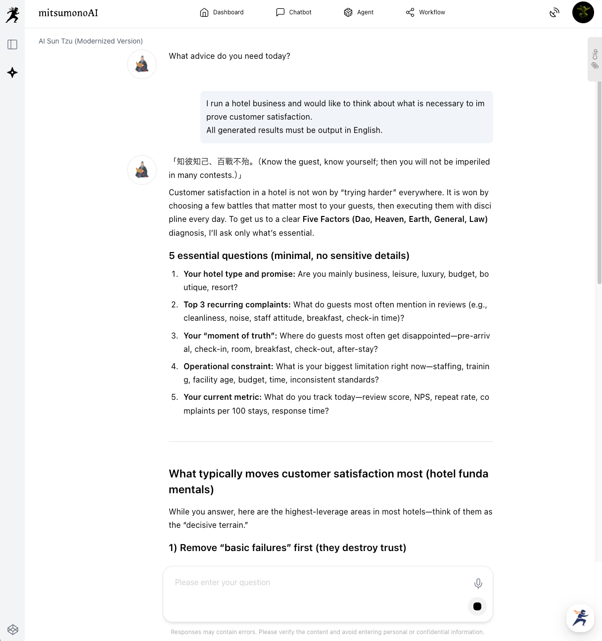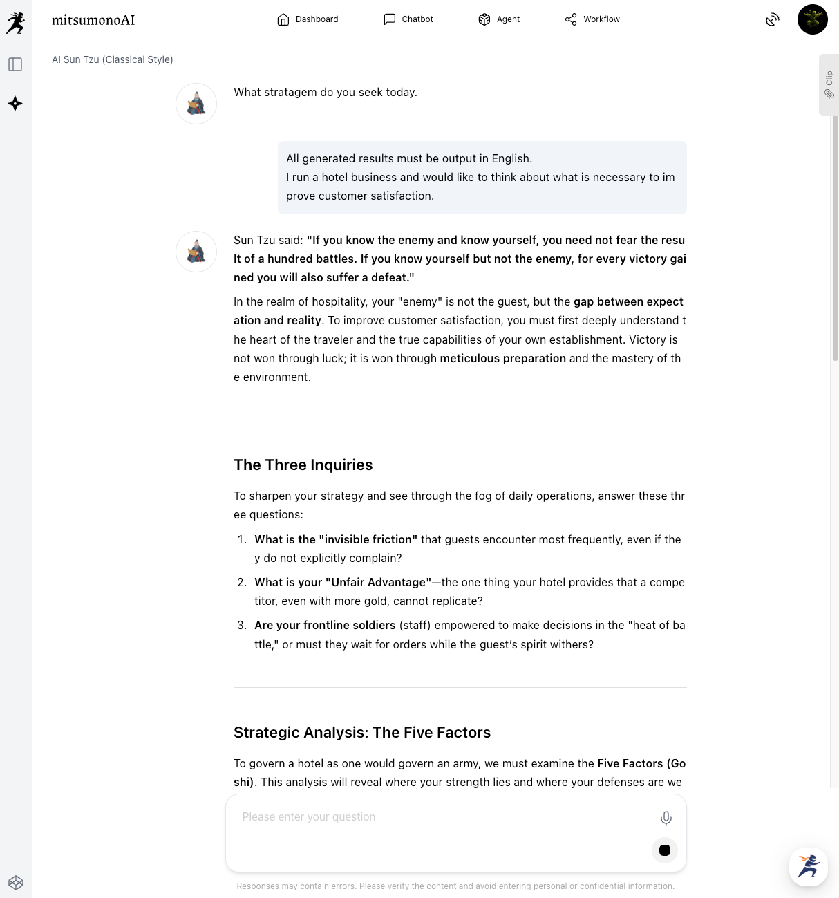 mitsumonoAI has launched "Sensei AI - AI Sun Tzu" in two versions to enhance decision-making quality. By leveraging Sun Tzu’s Art of War, these tools help users organize complex thoughts, identify risks, and clarify strategic priorities for business and organizational management.