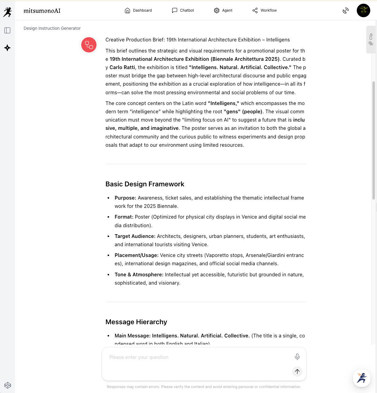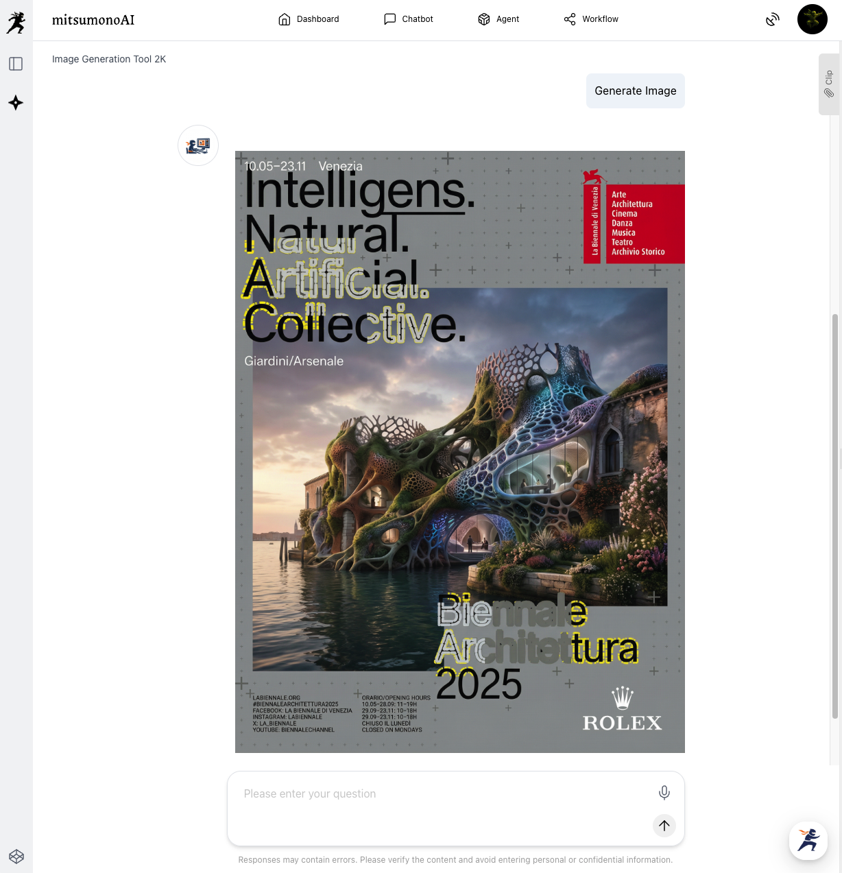 Within seconds, the AI produces a visionary, professional poster that captures the intellectual and futuristic spirit of the Venice Biennale.